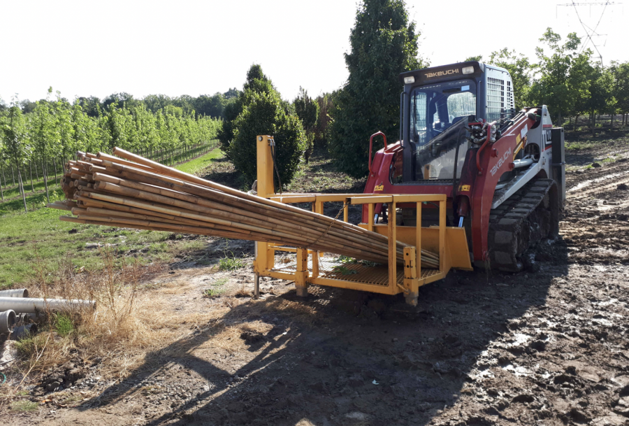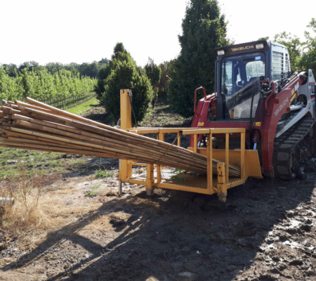 Le Staker de Dutchman est conçu pour minimiser le temps et le coût du tuteurage de grandes quantités d'arbres. Les tuteurs peuvent être solidement ancrés dans un trou pilote jusqu'à 60 cm de profondeur. À raison de 15 secondes par arbre, le Staker peut en tuteurer des milliers par jour. Il se raccorde au système hydraulique auxiliaire de la plupart des chargeuses compactes.