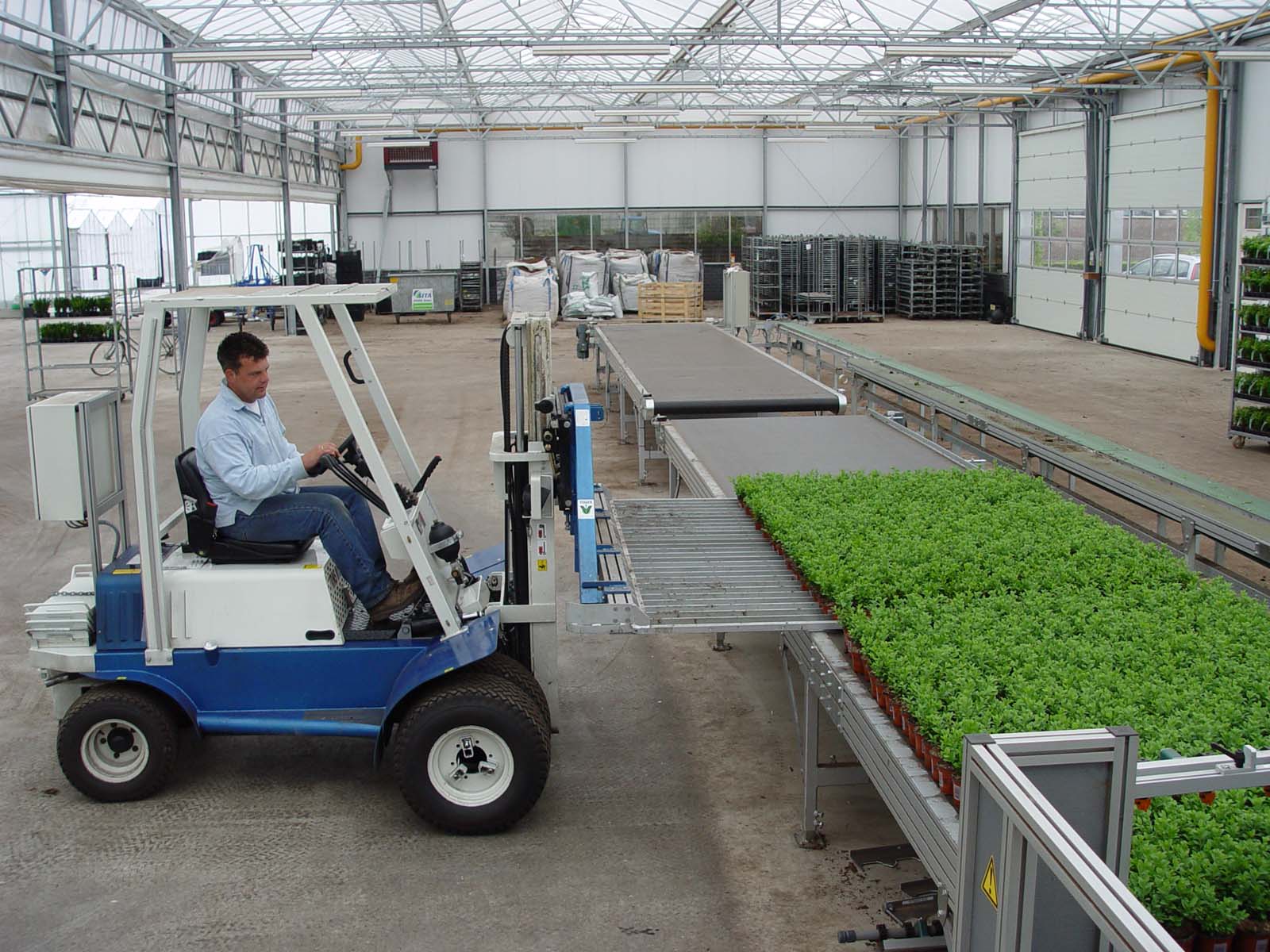 Le système de manutention Space O Mat de Visser a été conçu pour réduire le temps de travail et les coûts de main d'œuvre grâce à l'automatisation du transport des pots et des plaques de culture dans les serres. Une fois que l'activité de production est terminée, les pots ou les plaques de culture sont acheminés par la ligne de manutention où le chariot élévateur muni d'une fourche de plaçage ou de distançage viendra les saisir pour les trasporter à l'endroit désiré.